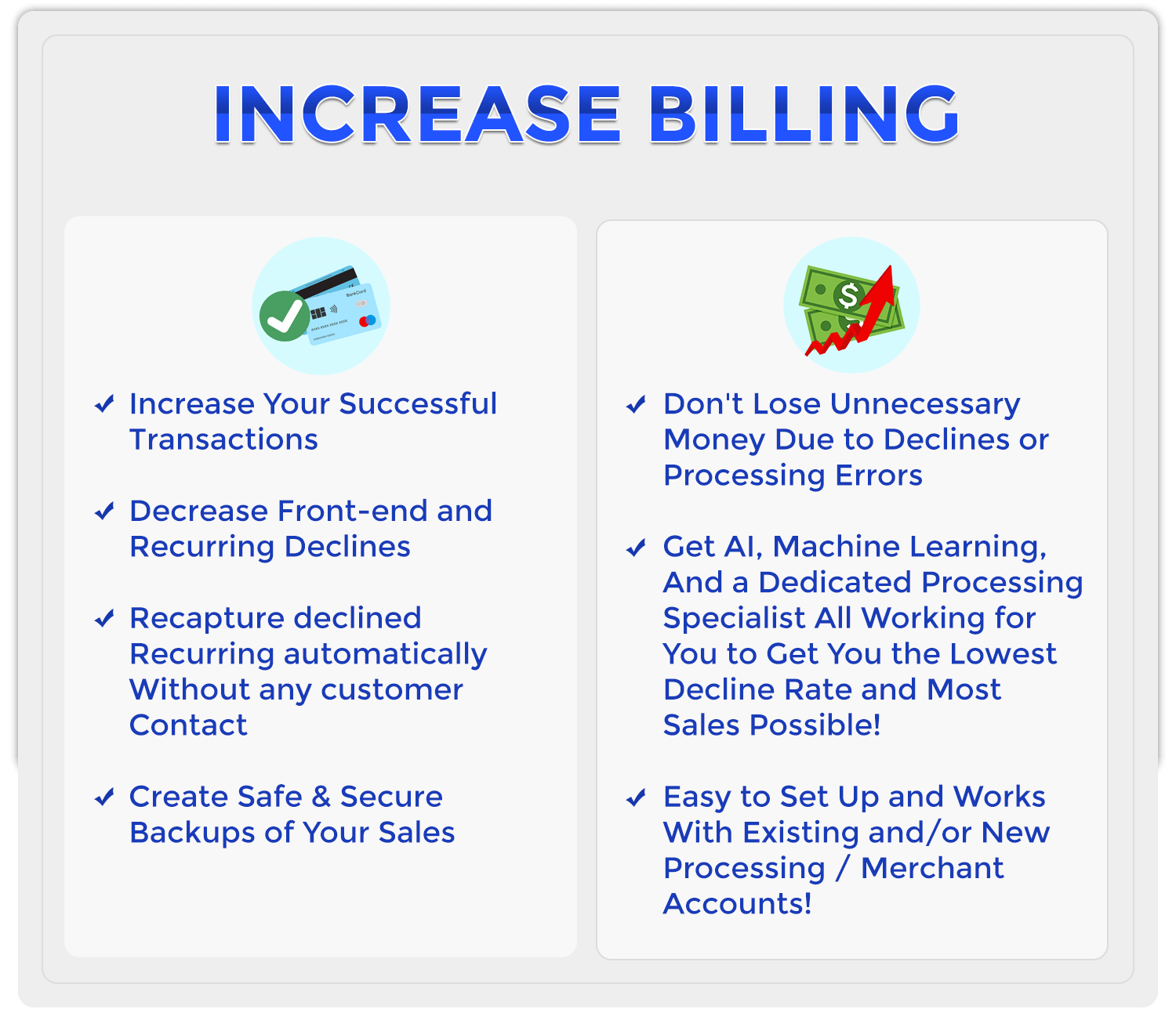 Rizify's Increase Billing will help increase the number of successful transactions you get, regardless of what payment gateways or platforms you're using. This lets you make more money without changing anything else in your business. Best of all you can get started right away! Watch the video here to get a brief overview, or check out our specific features below to see how you can be essentially printing more money today!